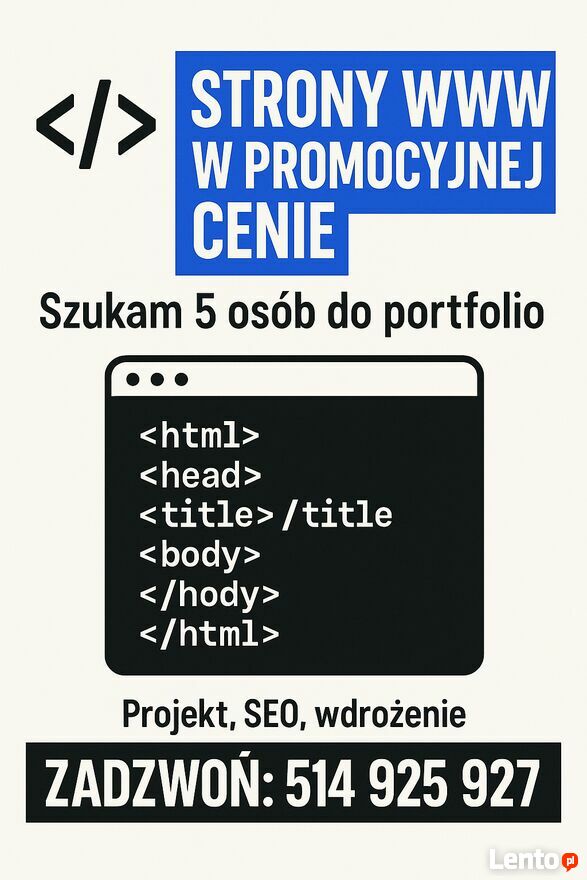 Hej!Jestem młodszym web developerem, który rozwija swoje portfolio i szukam 5 chętnych osób lub firm, które chcą mieć nowoczesną, szybką i w pełni dopasowaną stronę internetową w obniżonej cenie.
