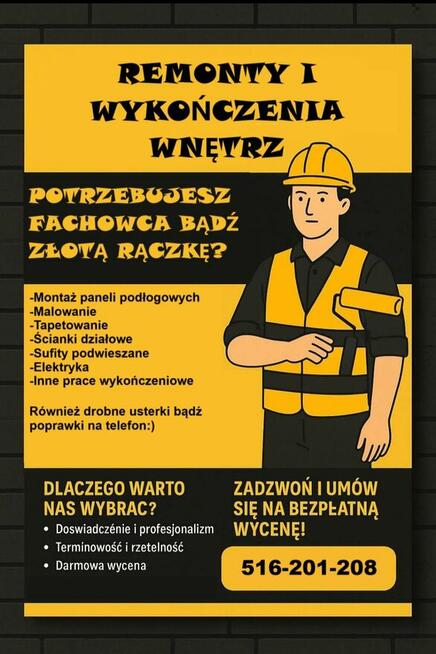 Usługi remontowe z gwarancją 24/7 Malowanie od 15zł/m2 Tapetowanie 20-30/m2 Gładzie 30-40zł/m2 Zabudowy od ...